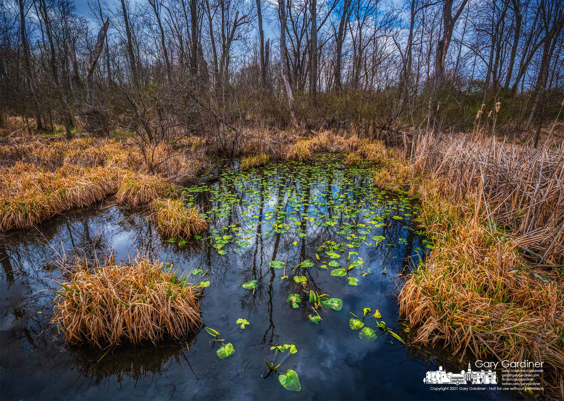 Lilypads begin to show themselves on the smooth waters of Boyer Nature Preserve as the hours of the day are warmer and longer encouraging Spring growth in the wetland. My Final Photo for April 1, 2021.