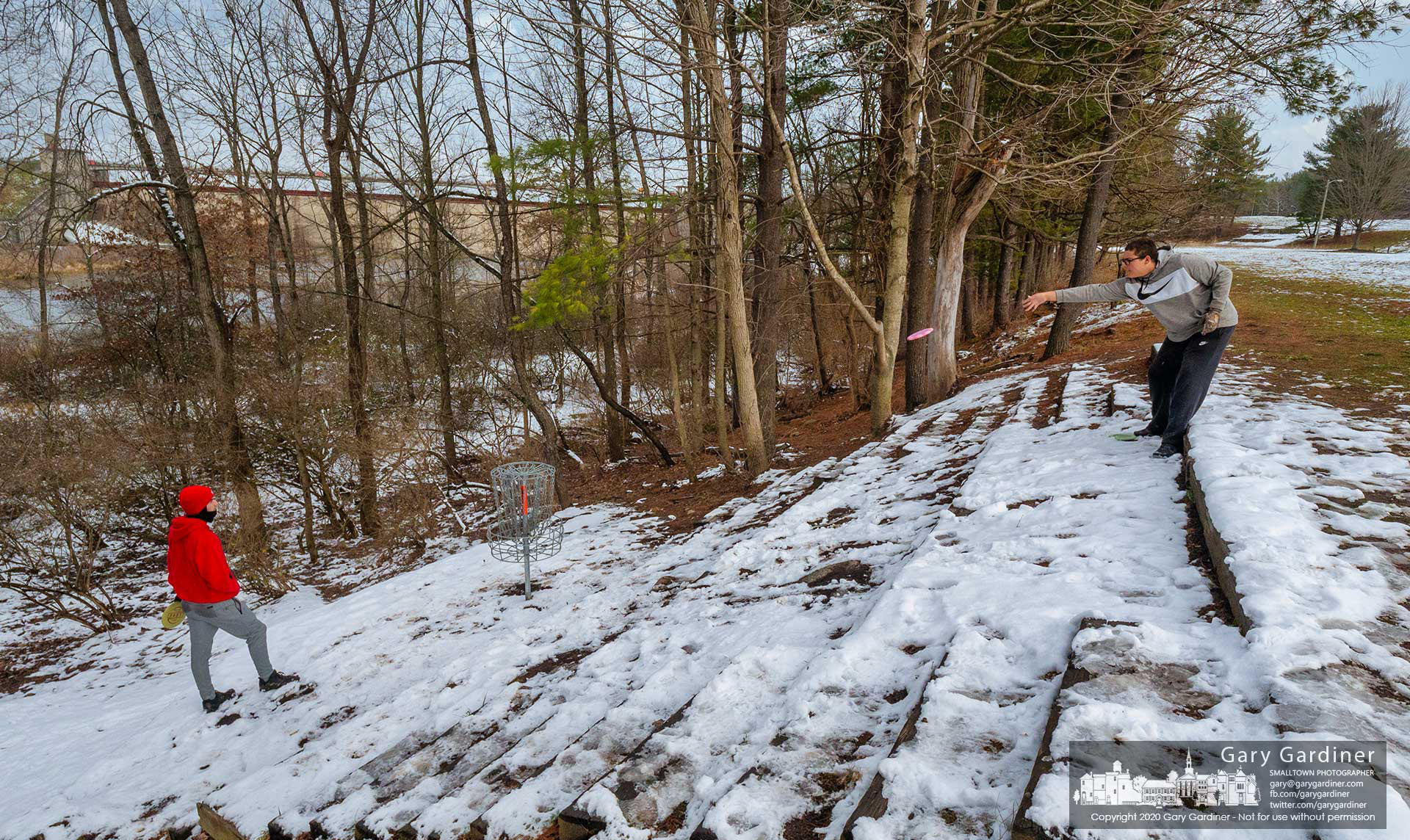 The small stream feeding into Boyer Nature Preserve beneath a portion of the raised walkway blends into the frozen waters of the wetlands. My Final Photo for Feb. 18, 2021.