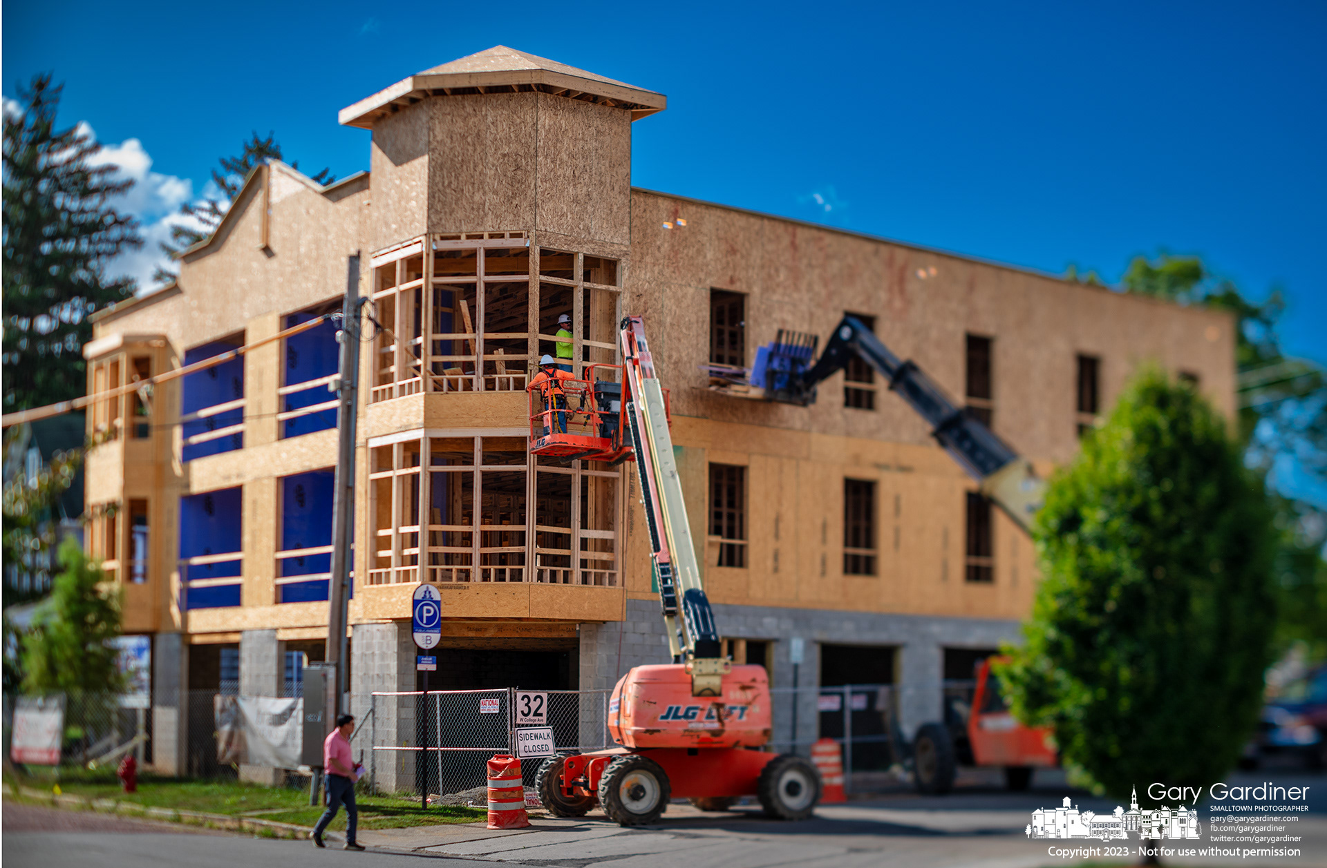 Workers install windows in the upper floor apartments of a building being built on West College where the Book Harbor once stood. My Final Photo for September 20, 2023.
